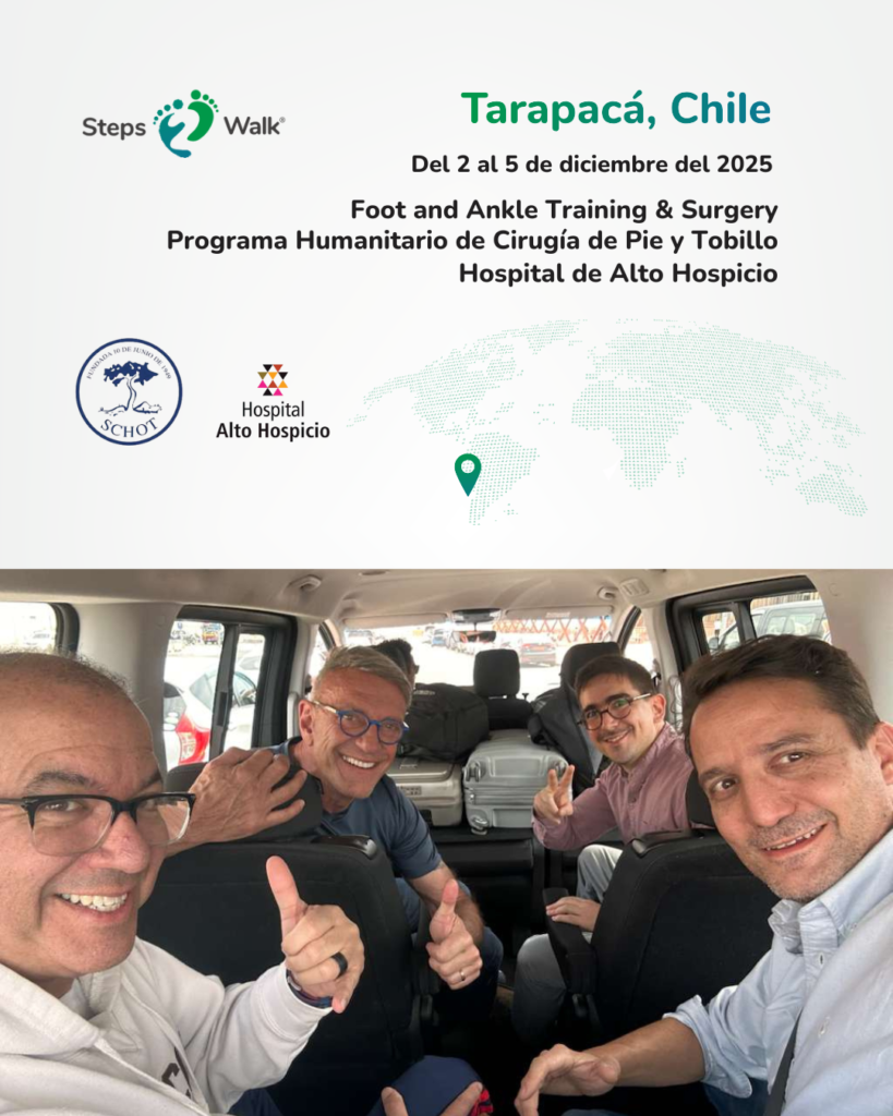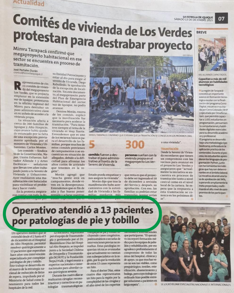 Entre el 2 y el 5 de diciembre, en el Hospital de Alto Hospicio, se realizó de forma exitosa la séptima versión del operativo quirúrgico de tobillo y pie que anualmente organiza la fundación Steps2Walk en conjunto con la Sociedad Chilena de Ortopedia y Traumatología (SCHOT), en coordinación con el Servicio de Salud Tarapacá, instancia que permitió resolver quirúrgicamente 13 casos severos que llevaban años en espera, mediante cirugías reconstructivas y correctivas de alto nivel.