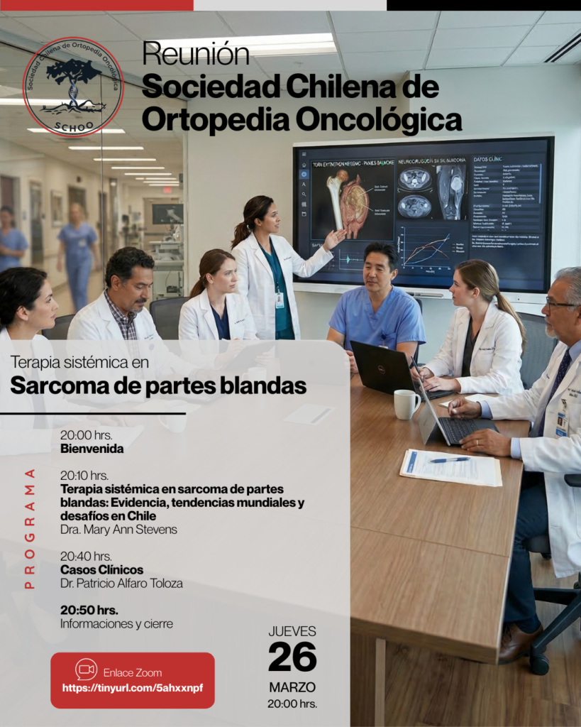 La Sociedad Chilena de Ortopedia y Traumatología los invita a participar de la Reunión de la Sociedad Chilena de Ortopedia Oncológica que se realizará el jueves 26 de marzo a partir de las 20:00 hrs en formato online.